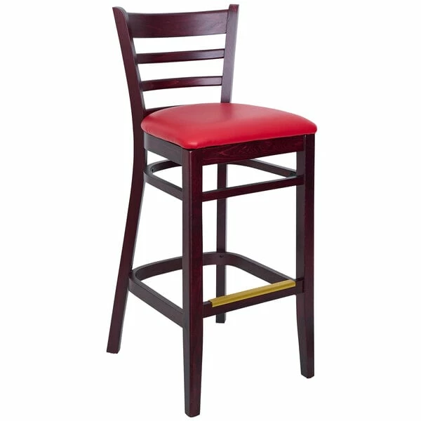 BFM Seating Berkeley Dark Mahogany Beechwood Ladder Back Barstool With 2″ Red Vinyl Seat