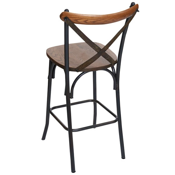 BFM Seating Henry Distressed Rustic Clear Coated Steel X-Back Counter Height Stool With Autumn Ash Wooden Back And Seat