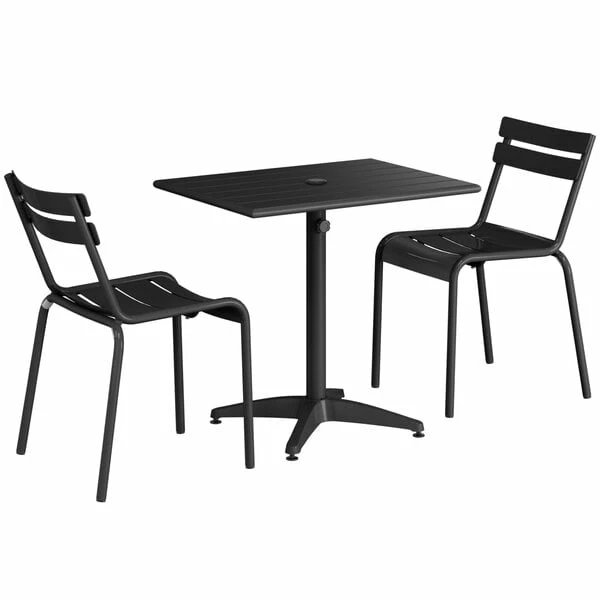 Lancaster Table & Seating 24″ X 32″ Black Powder-Coated Aluminum Standard Height Outdoor Table With Umbrella Hole And 2 Side Chairs
