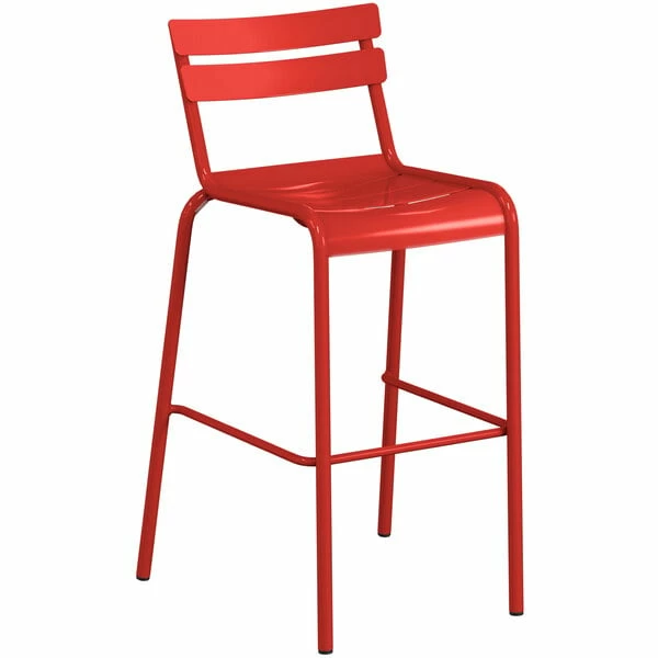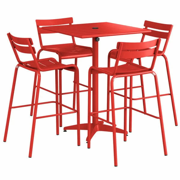 Lancaster Table & Seating 32″ X 32″ Red Powder-Coated Aluminum Bar Height Outdoor Table With Umbrella Hole And 4 Barstools