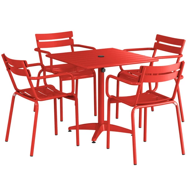 Lancaster Table & Seating 32″ X 32″ Red Powder-Coated Aluminum Dining Height Outdoor Table With Umbrella Hole And 4 Arm Chairs