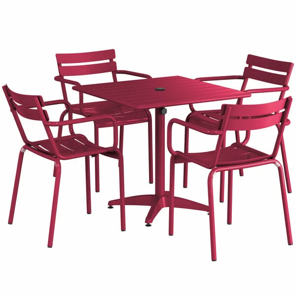 Lancaster Table & Seating 32″ X 32″ Sangria Powder-Coated Aluminum Standard Height Outdoor Table With Umbrella Hole And 4 Arm Chairs