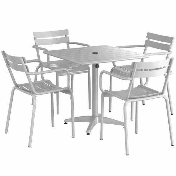 Lancaster Table & Seating 32″ X 32″ Silver Powder-Coated Aluminum Dining Height Outdoor Table With Umbrella Hole And 4 Arm Chairs