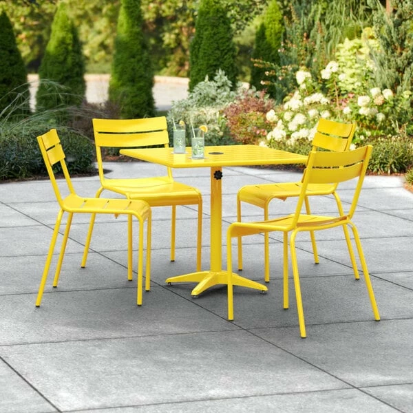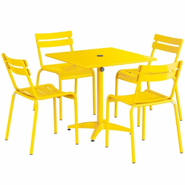 Lancaster Table & Seating 32″ X 32″ Yellow Powder-Coated Aluminum Standard Height Outdoor Table With Umbrella Hole And 4 Side Chairs