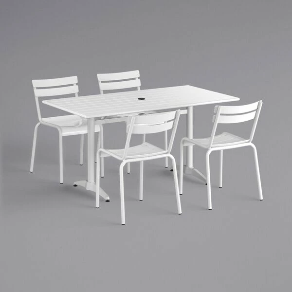 Lancaster Table & Seating 32″ X 60″ White Powder-Coated Aluminum Dining Height Outdoor Table With Umbrella Hole And 4 Side Chairs