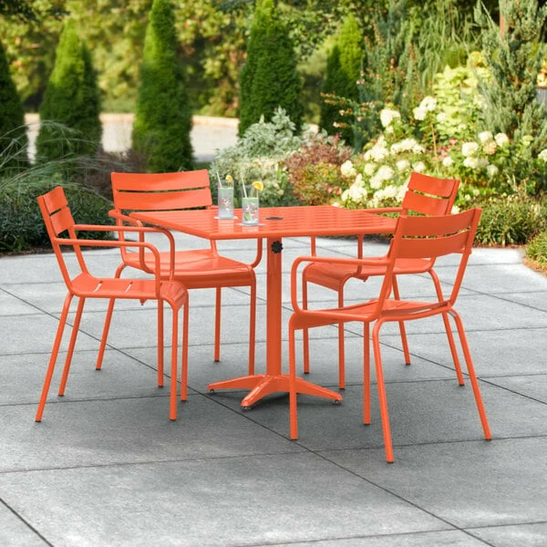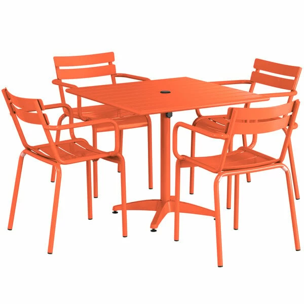 Lancaster Table & Seating 36″ X 36″ Orange Powder-Coated Aluminum Standard Height Outdoor Table With Umbrella Hole And 4 Arm Chairs