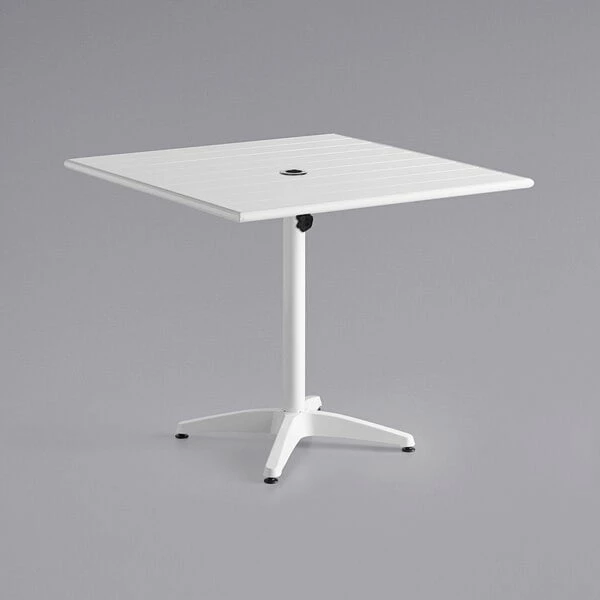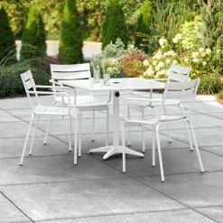 Lancaster Table & Seating 36″ X 36″ White Powder-Coated Aluminum Dining Height Outdoor Table With Umbrella Hole And 4 Arm Chairs