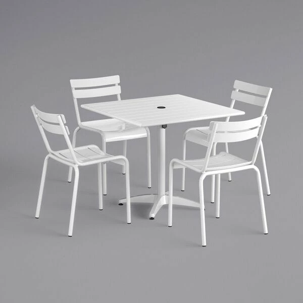 Lancaster Table & Seating 36″ X 36″ White Powder-Coated Aluminum Dining Height Outdoor Table With Umbrella Hole And 4 Side Chairs