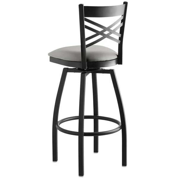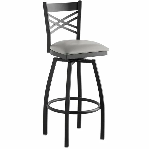 Lancaster Table & Seating Black Finish Cross Back Swivel Bar Stool With 2 1/2″ Light Gray Vinyl Padded Seat