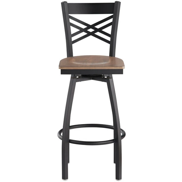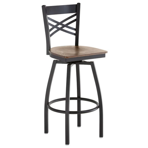 Lancaster Table & Seating Black Finish Cross Back Swivel Bar Stool With Vintage Wood Seat