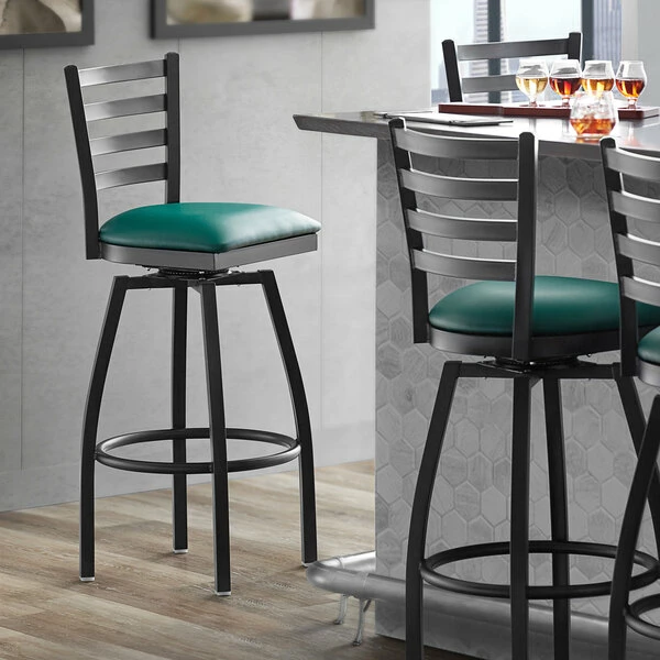 Lancaster Table & Seating Black Finish Ladder Back Swivel Bar Stool With 2 1/2″ Green Vinyl Padded Seat