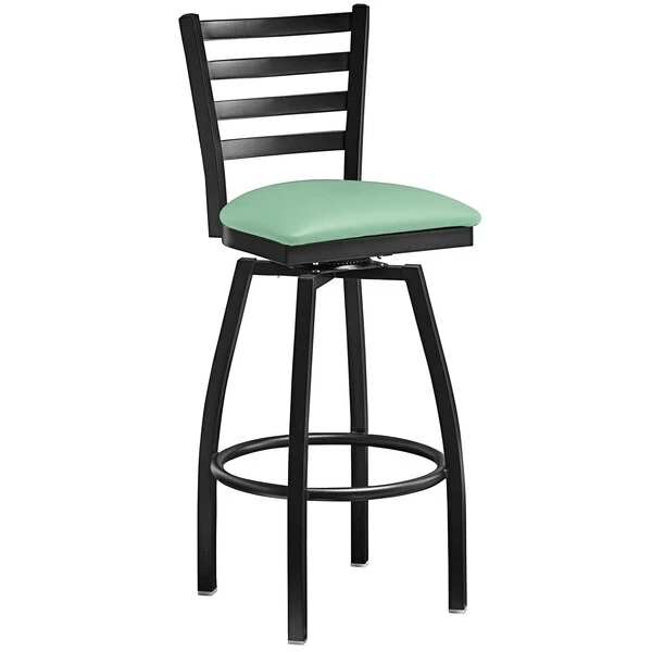 Lancaster Table & Seating Black Finish Ladder Back Swivel Bar Stool With 2 1/2″ Seafoam Vinyl Padded Seat