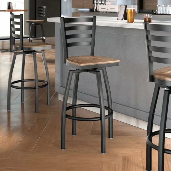 Lancaster Table & Seating Black Finish Ladder Back Swivel Bar Stool With Vintage Wood Seat