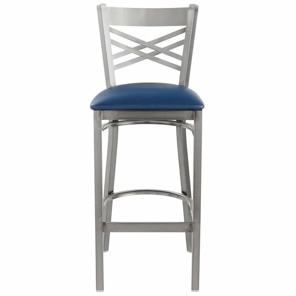 Lancaster Table & Seating Clear Coat Finish Cross Back Bar Stool With 2 1/2″ Navy Vinyl Padded Seat