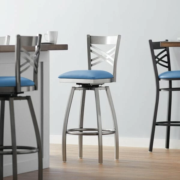 Lancaster Table & Seating Clear Coat Finish Cross Back Swivel Bar Stool With 2 1/2″ Blue Vinyl Padded Seat