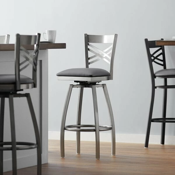 Lancaster Table & Seating Clear Coat Finish Cross Back Swivel Bar Stool With 2 1/2″ Dark Gray Vinyl Padded Seat