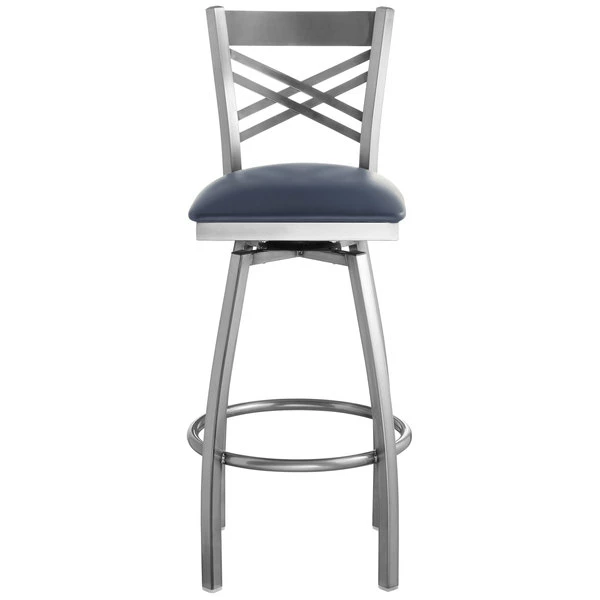 Lancaster Table & Seating Clear Coat Finish Cross Back Swivel Bar Stool With 2 1/2″ Navy Vinyl Padded Seat