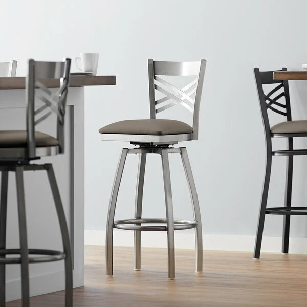 Lancaster Table & Seating Clear Coat Finish Cross Back Swivel Bar Stool With 2 1/2″ Taupe Vinyl Padded Seat