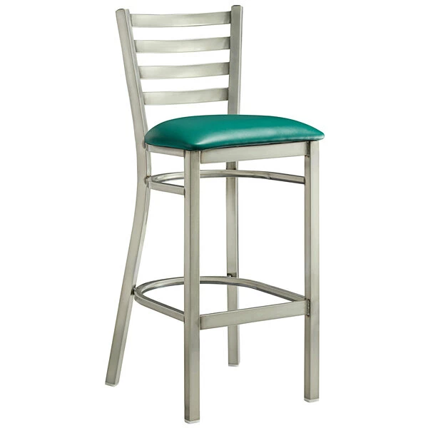 Lancaster Table & Seating Clear Coat Finish Ladder Back Bar Stool With 2 1/2″ Green Vinyl Padded Seat
