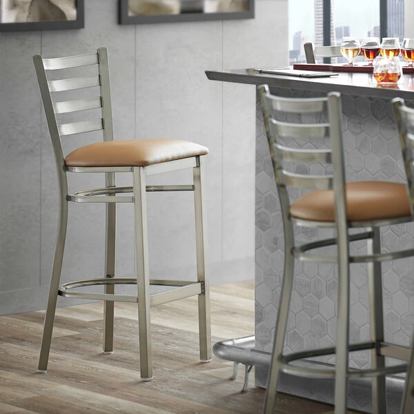 Lancaster Table & Seating Clear Coat Finish Ladder Back Bar Stool With 2 1/2″ Light Brown Vinyl Padded Seat