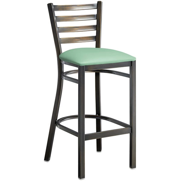 Lancaster Table & Seating Distressed Copper Finish Ladder Back Bar Stool With 2 1/2″ Seafoam Vinyl Padded Seat