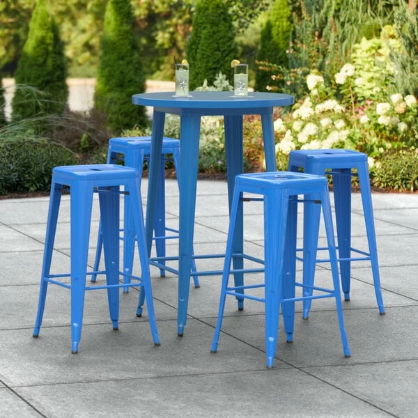 LT&S Alloy Series Lancaster Table & Seating Alloy Series 30″ Round Blue Outdoor Bar Height Table With Four Barstools