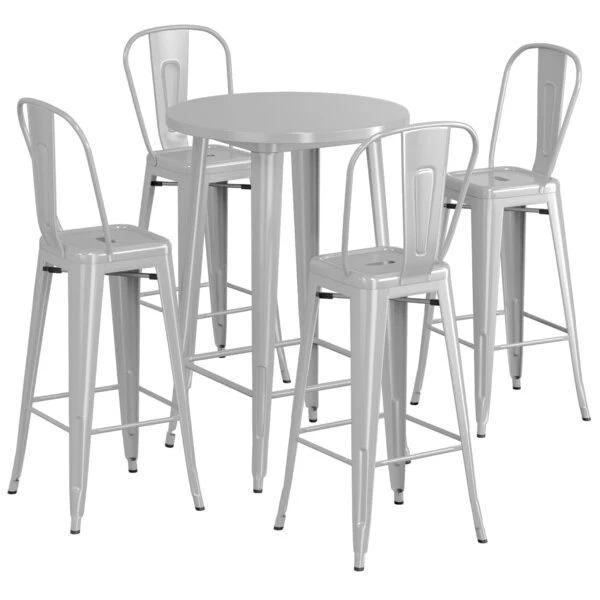LT&S Alloy Series Lancaster Table & Seating Alloy Series 30″ Round Silver Outdoor Bar Height Table With 4 Metal Cafe Bar Stools