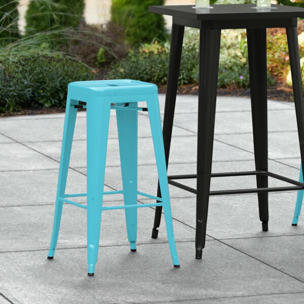 LT&S Alloy Series Lancaster Table & Seating Alloy Series Arctic Blue Stackable Metal Indoor / Outdoor Industrial Barstool With Drain Hole Seat