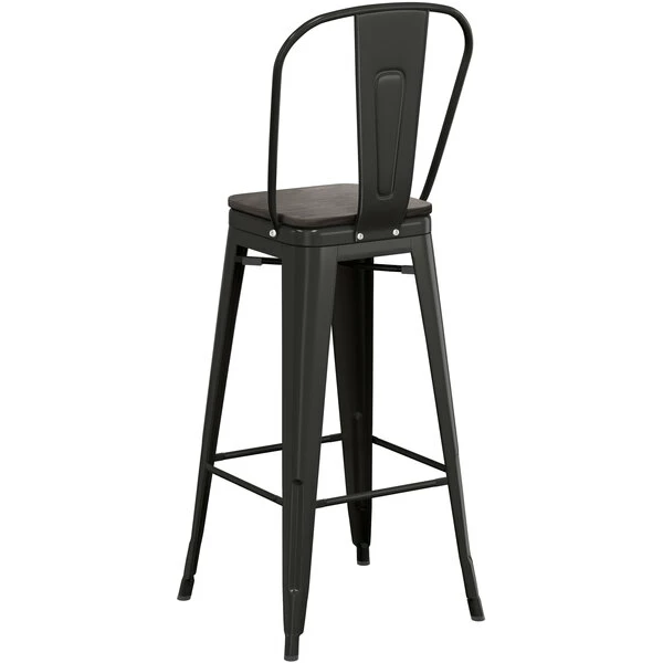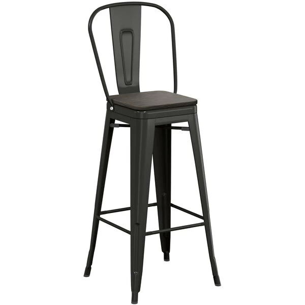 LT&S Alloy Series Lancaster Table & Seating Alloy Series Black Metal Indoor Industrial Cafe Bar Height Stool With Vertical Slat Back And Black Wood Seat