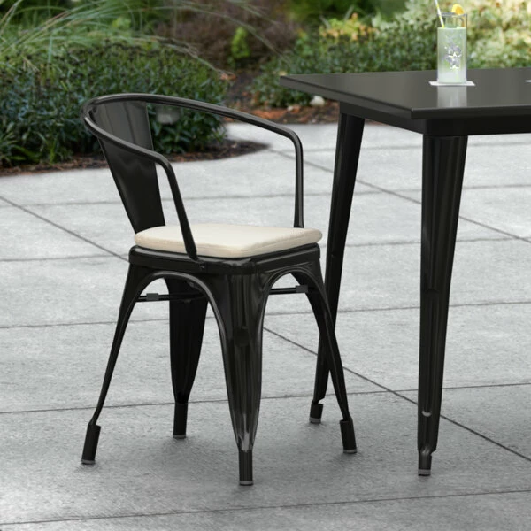 LT&S Alloy Series Lancaster Table & Seating Alloy Series Black Stackable Metal Indoor / Outdoor Industrial Cafe Arm Chair With Tan Fabric Magnetic Cushion