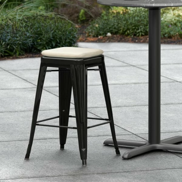 LT&S Alloy Series Lancaster Table & Seating Alloy Series Black Stackable Metal Indoor / Outdoor Industrial Cafe Counter Height Stool With Tan Fabric Magnetic Cushion