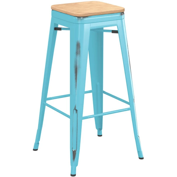 LT&S Alloy Series Lancaster Table & Seating Alloy Series Distressed Arctic Blue Stackable Metal Indoor Industrial Barstool With Natural Wood Seat