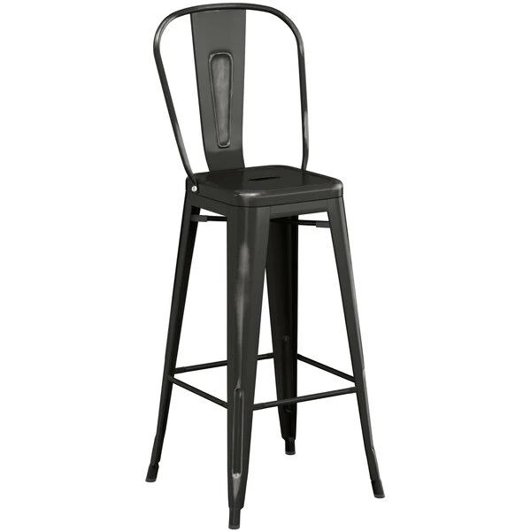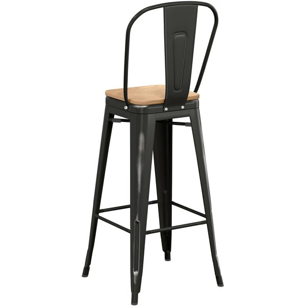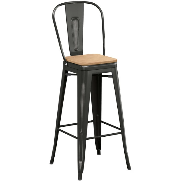 LT&S Alloy Series Lancaster Table & Seating Alloy Series Distressed Black Metal Indoor Industrial Cafe Bar Height Stool With Vertical Slat Back And Natural Wood Seat