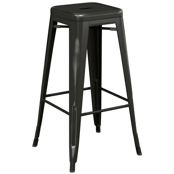 LT&S Alloy Series Lancaster Table & Seating Alloy Series Distressed Black Stackable Metal Indoor / Outdoor Industrial Barstool With Drain Hole Seat
