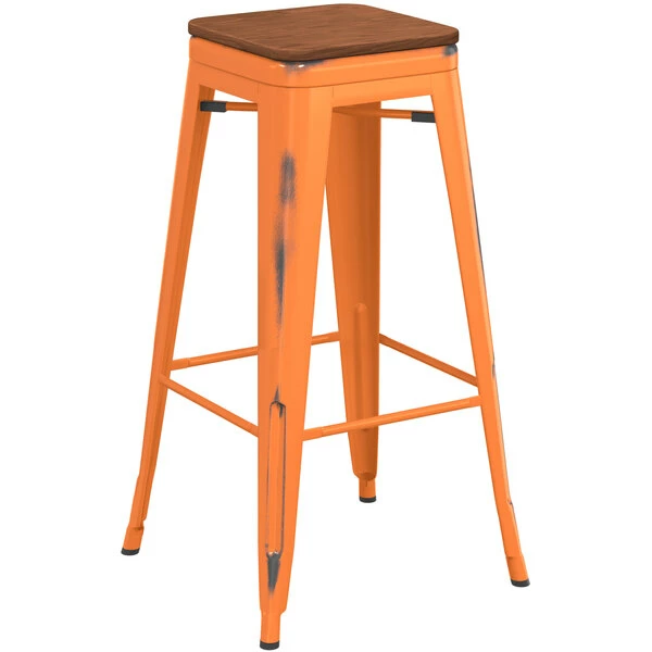 LT&S Alloy Series Lancaster Table & Seating Alloy Series Distressed Orange Stackable Metal Indoor Industrial Barstool With Walnut Wood Seat