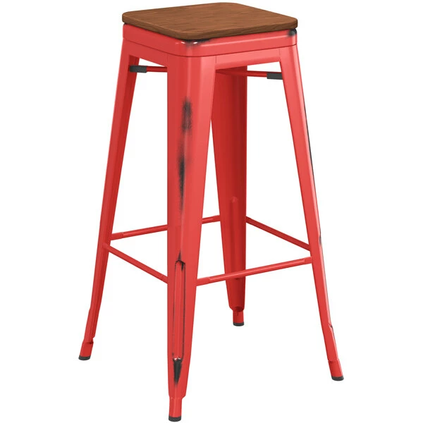 LT&S Alloy Series Lancaster Table & Seating Alloy Series Distressed Red Metal Indoor Industrial Cafe Bar Height Stool With Walnut Wood Seat