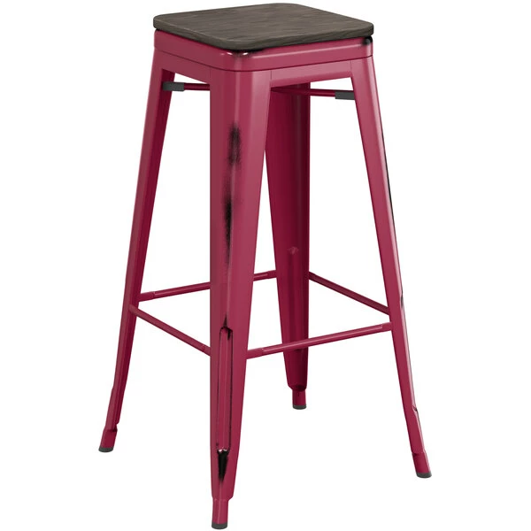 LT&S Alloy Series Lancaster Table & Seating Alloy Series Distressed Sangria Stackable Metal Indoor Industrial Barstool With Black Wood Seat