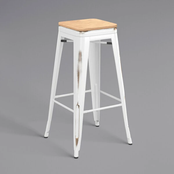 LT&S Alloy Series Lancaster Table & Seating Alloy Series Distressed White Stackable Metal Indoor Industrial Barstool With Natural Wood Seat