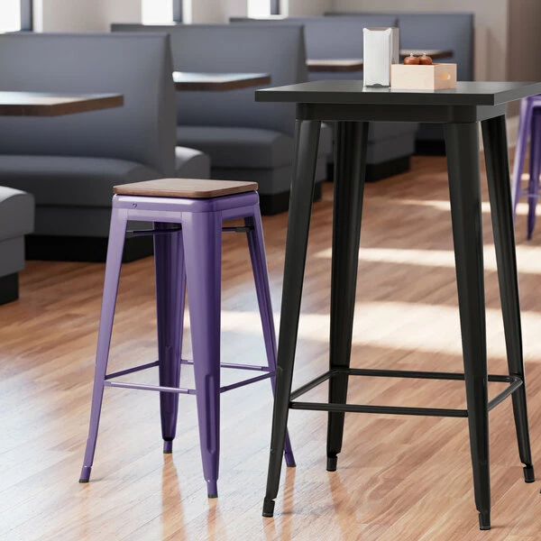 LT&S Alloy Series Lancaster Table & Seating Alloy Series Purple Metal Indoor Industrial Cafe Bar Height Stool With Walnut Wood Seat