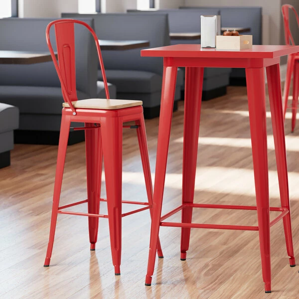 LT&S Alloy Series Lancaster Table & Seating Alloy Series Red Metal Indoor Industrial Cafe Bar Height Stool With Vertical Slat Back And Natural Wood Seat