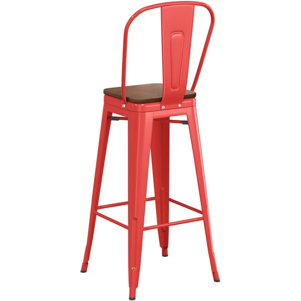 LT&S Alloy Series Lancaster Table & Seating Alloy Series Red Metal Indoor Industrial Cafe Bar Height Stool With Vertical Slat Back And Walnut Wood Seat