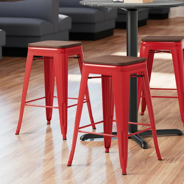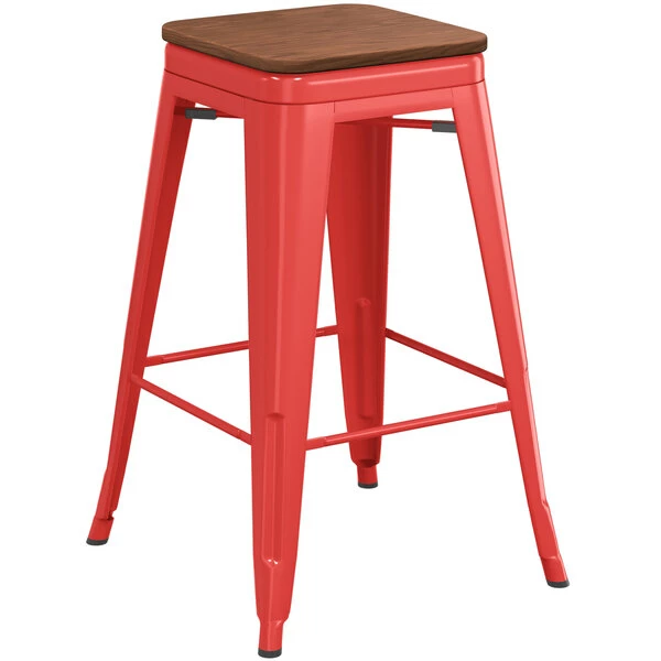 LT&S Alloy Series Lancaster Table & Seating Alloy Series Red Metal Indoor Industrial Cafe Counter Height Stool With Walnut Wood Seat