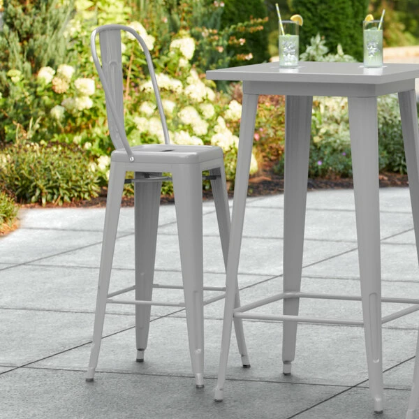 LT&S Alloy Series Lancaster Table & Seating Alloy Series Silver Metal Indoor / Outdoor Industrial Cafe Barstool With Vertical Slat Back And Drain Hole Seat