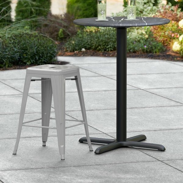 LT&S Alloy Series Lancaster Table & Seating Alloy Series Silver Stackable Metal Indoor / Outdoor Industrial Cafe Counter Height Stool With Drain Hole Seat