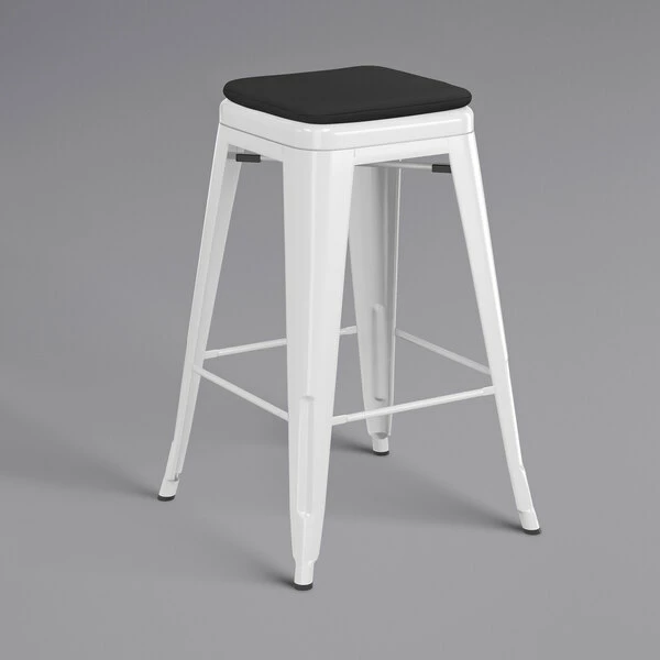 LT&S Alloy Series Lancaster Table & Seating Alloy Series White Stackable Metal Indoor / Outdoor Industrial Cafe Counter Height Stool With Black Fabric Magnetic Cushion