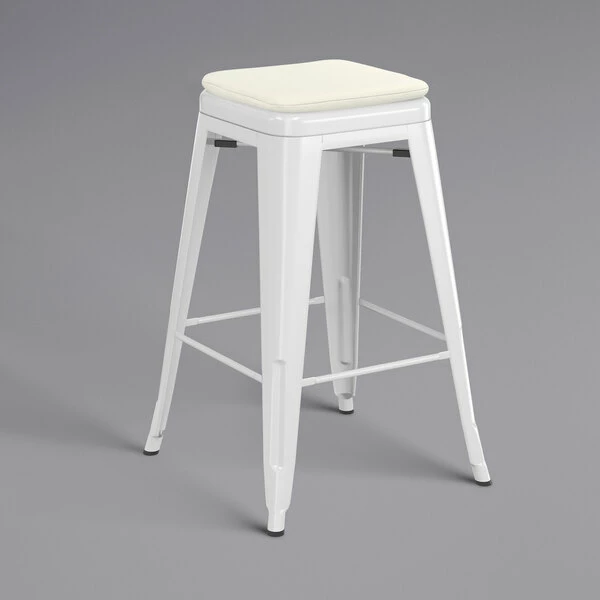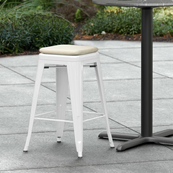 LT&S Alloy Series Lancaster Table & Seating Alloy Series White Stackable Metal Indoor / Outdoor Industrial Cafe Counter Height Stool With Tan Fabric Magnetic Cushion