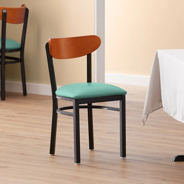 LT&S Boomerang Series Lancaster Table & Seating Boomerang Black Finish Chair With 2 1/2″ Seafoam Vinyl Padded Seat And Cherry Wood Back