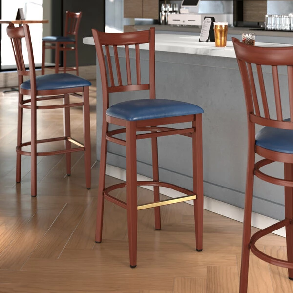 LT&S Spartan Series Lancaster Table & Seating Spartan Series Bar Height Metal Slat Back Chair With Mahogany Wood Grain Finish And Navy Vinyl Seat
