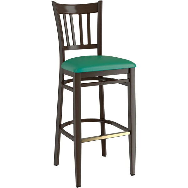 LT&S Spartan Series Lancaster Table & Seating Spartan Series Bar Height Metal Slat Back Chair With Walnut Wood Grain Finish And Green Vinyl Seat