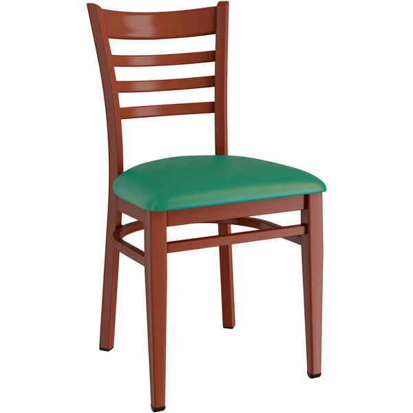 LT&S Spartan Series Lancaster Table & Seating Spartan Series Metal Ladder Back Chair With Mahogany Wood Grain Finish And Green Vinyl Seat